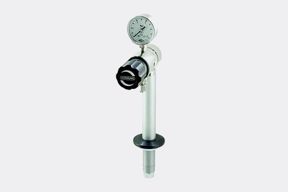 The supply station is HP 403 is a supply station and is mounted on a panel. It serves the safe supply of pure and mixed gases. The station is connected to gas supply line. A diaphragm shutoff valve and a single stage pressure regulator with gauge are supplied as standard.